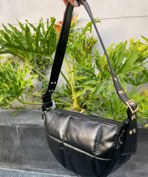 Descripción: Bolsa para Dama fabricada con material sintéticos Morgan en color negro. Cuenta con un compartimento general y uno màs interno; ambos con cierre. También cuenta con un asa ajustable al hombro con dos hebillas a los costados. Detalles y herrajes en color níquel.